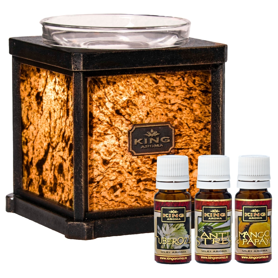 Pachetul conține: decorațiunea suport (material MDF), 1 bol sticlă pentru apă, 1 pahar sticlă pentru lumânare, 1 lumânare pastilă, 3 uleiuri parfumate aromaterapie 10 ml Kingaroma (diverse arome).