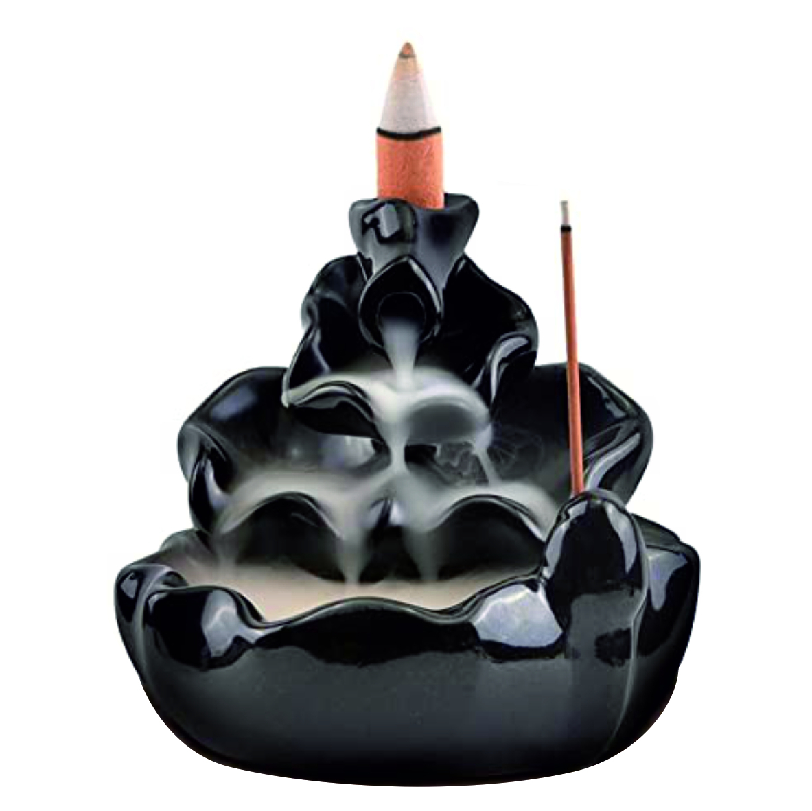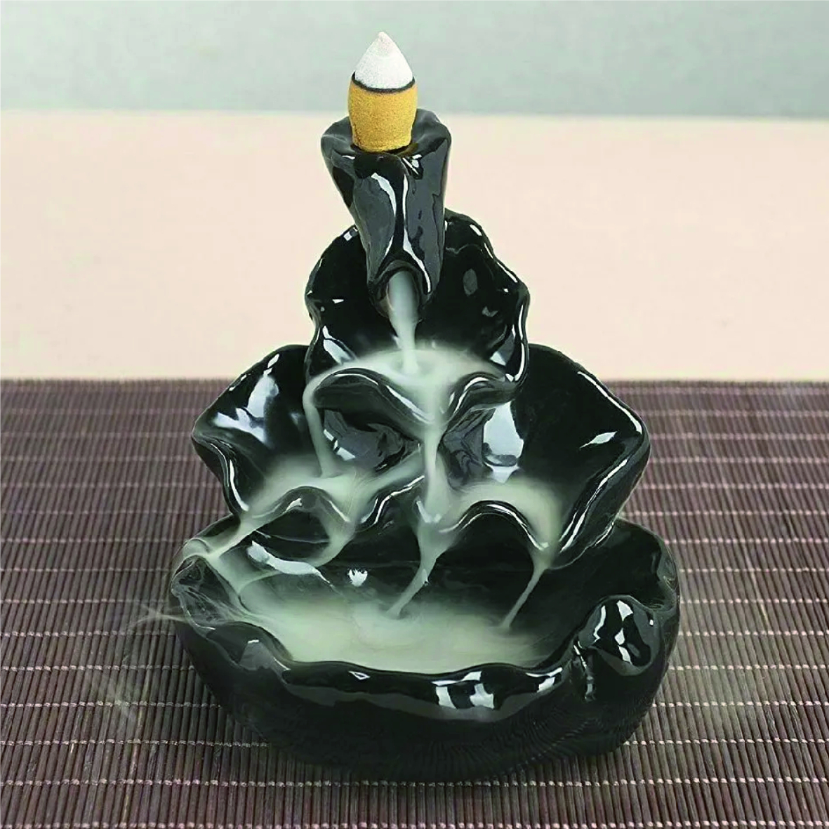 Conurile parfumate backflow se așează pe suport în partea superioară, după aprindere degajând un fum fin care curge asemenea unui fluid formând o cascadă.