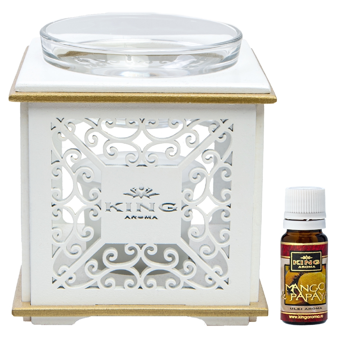 Pachetul conține: decorațiunea suport (material MDF), 1 bol sticlă pentru apă, 1 pahar sticlă pentru lumânare, 1 lumânare pastilă, 3 uleiuri aromaterapie de 10 ml Kingaroma (diverse arome).