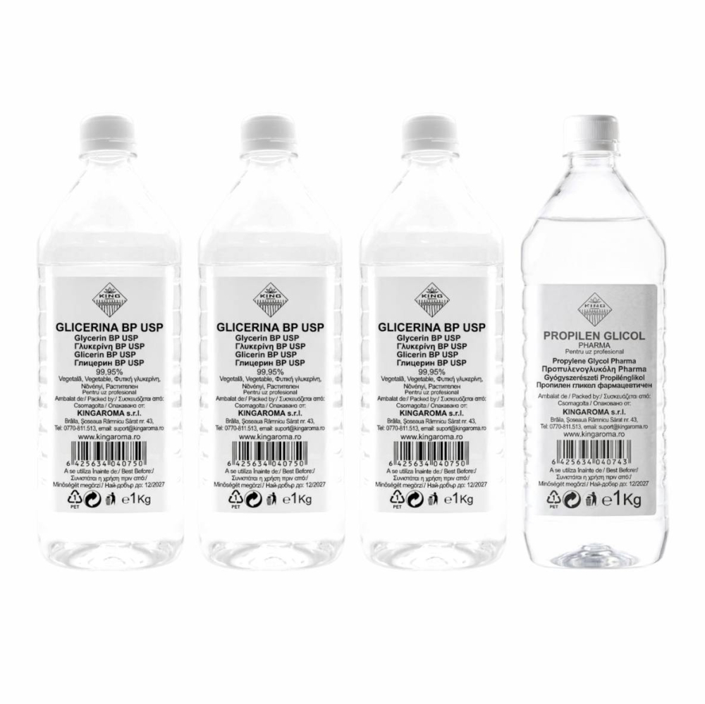 Pachetul Bază lichide VG/PG 4KG KING Aroma în proporție 3:1 este optim pentru aplicații unde este necesară o consistență mai densă și o retenție mai bună a umidității.
