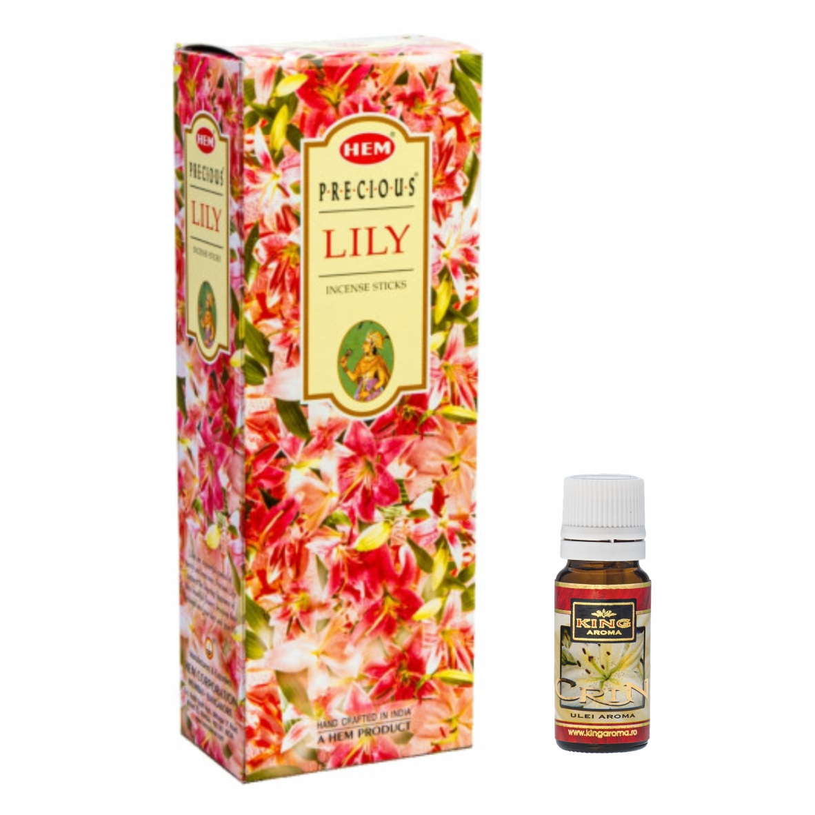 Pachetul contine 120 betisoare parfumate HEM Crin + Ulei aromaterapie Crin Kingaroma, 10 ml