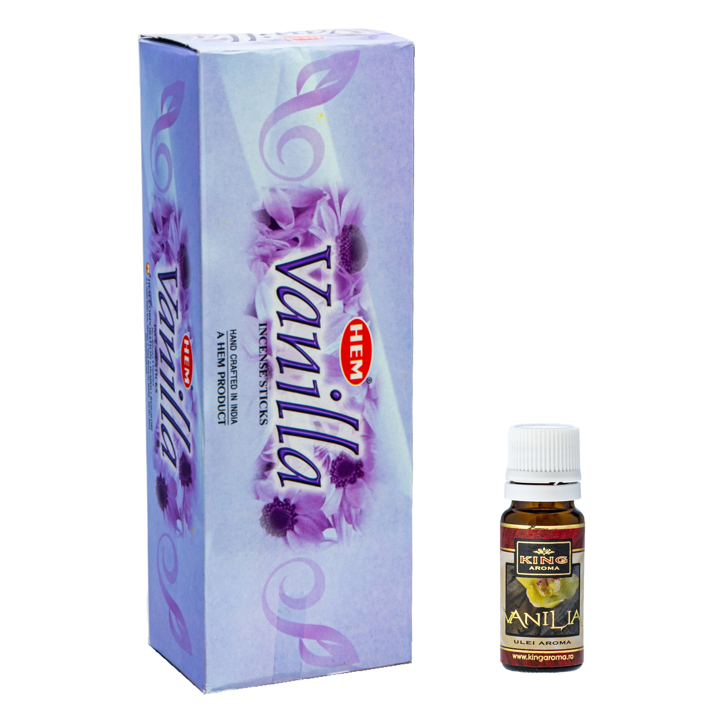 Pachetul contine 120 betisoare parfumate HEM Vanilie + Ulei aromaterapie Vanilie Kingaroma, 10 ml
