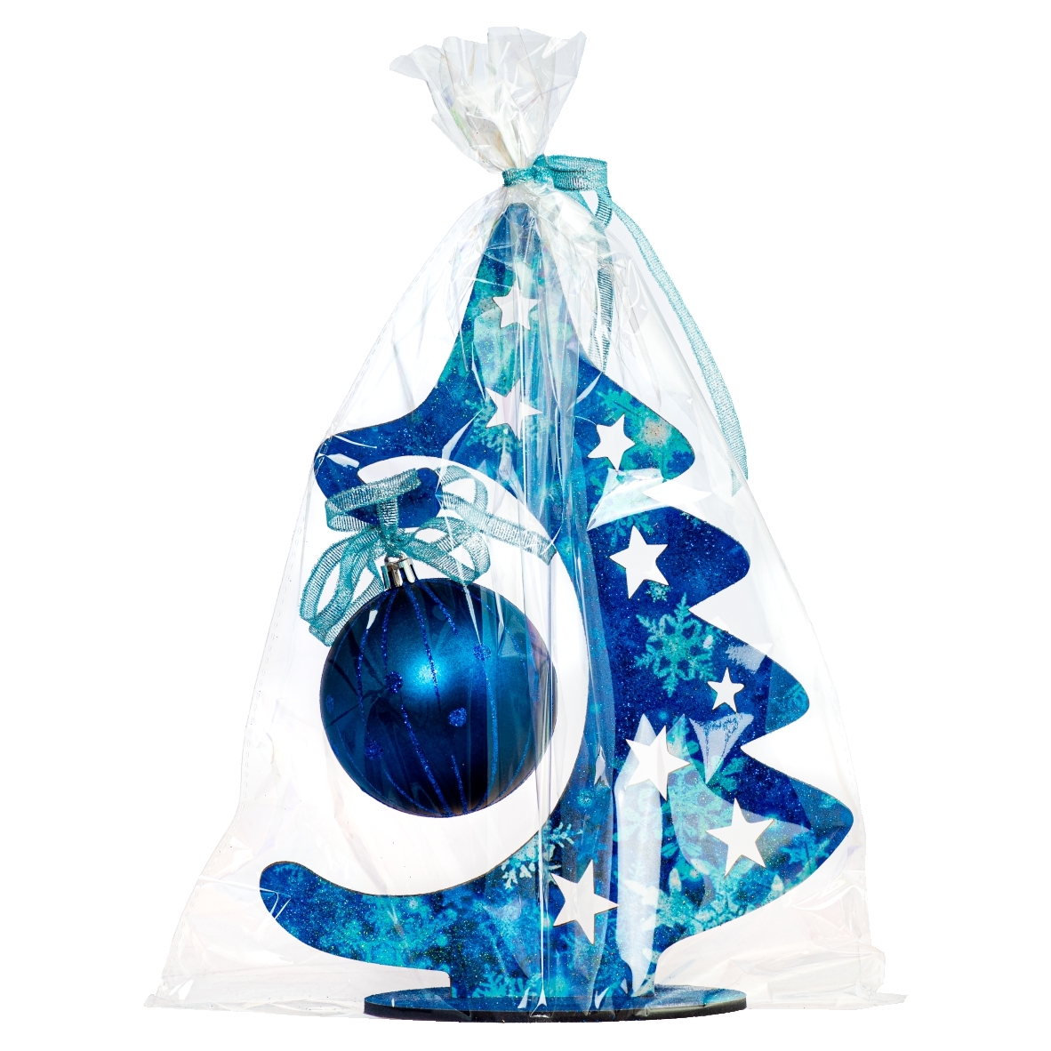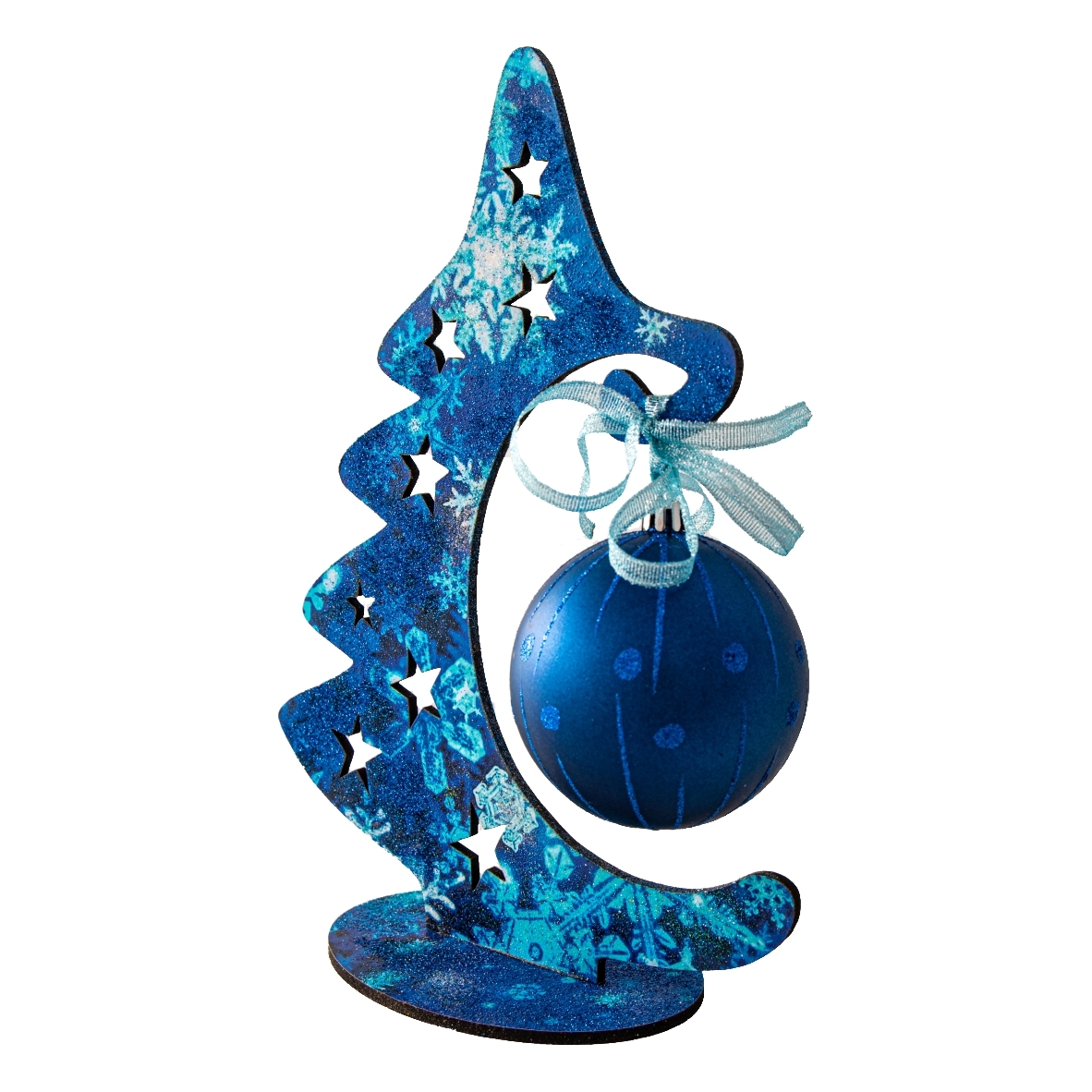 Brad din MDF de 4 mm acoperit cu autocolant printat, este decorat cu glob de diametru de 7 cm și tapetat cu glitter albastru.