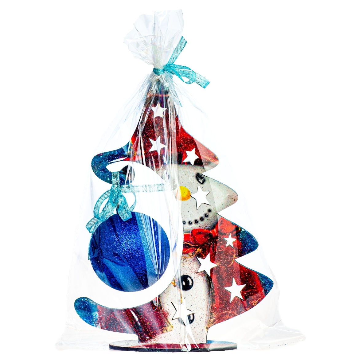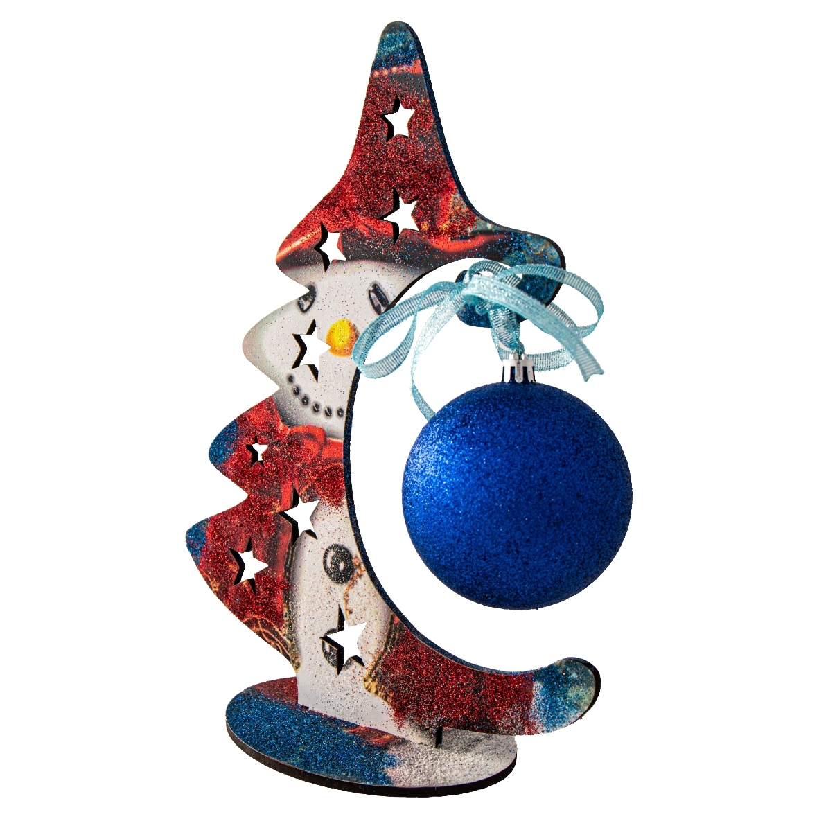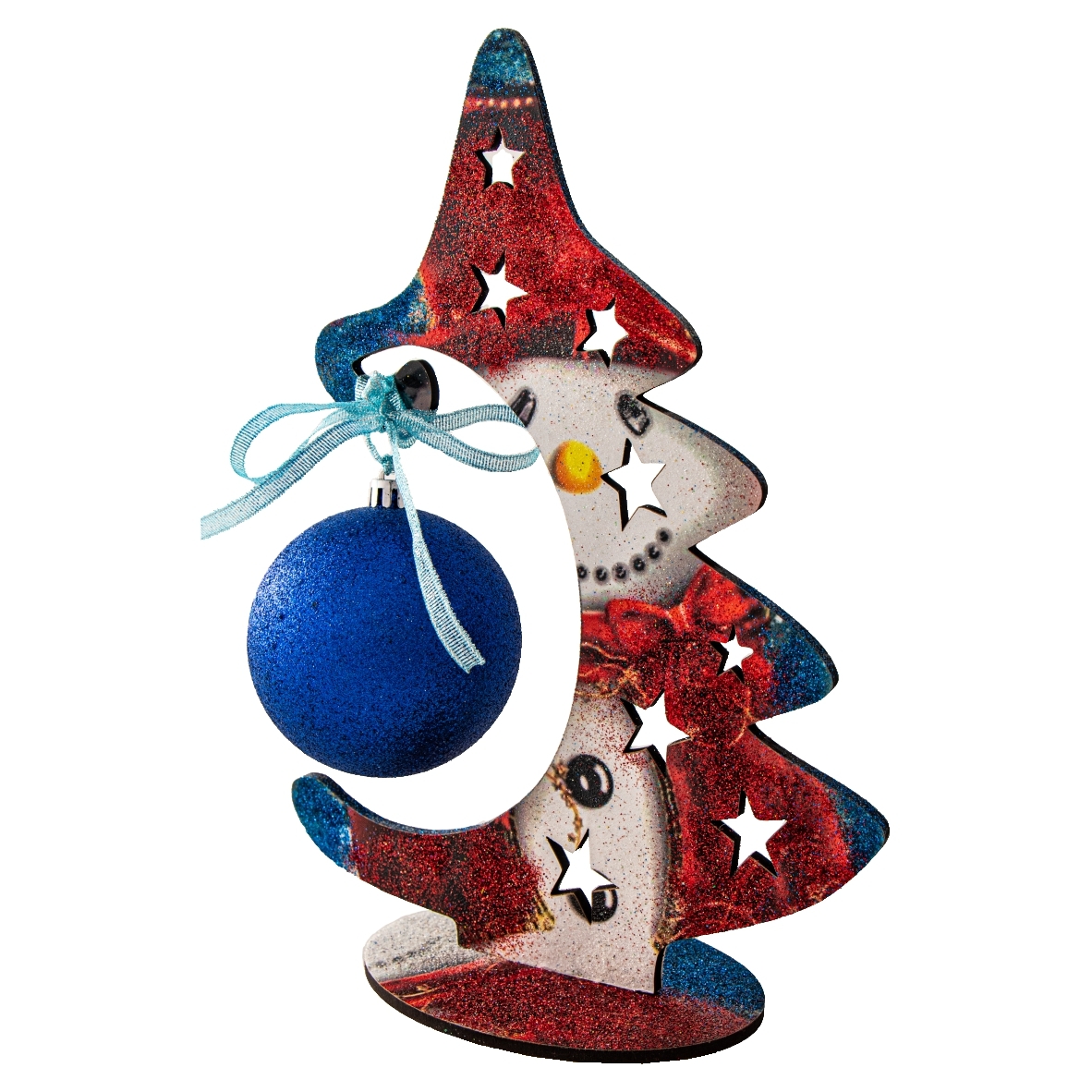 O decorațiune colorată și strălucitoare care va înveseli și va innobila căminul dumneavoastră pentru Sărbătoarea de Crăciun. Brad din MDF de 4 mm acoperit cu autocolant printat, este decorat cu glob de diametru de 7 cm și tapetat cu glitter roșu, albastru. Dimensiuni: înălțime 27 cm, lățime 20 cm. Culoarea globului poate să difere în funcție de stocurile disponibile. Decorațiunea se vinde ambalată în celofan transparent strans cu fundă de cadou, ceea ce o face un cadou deosebit pentru cei dragi. Produs cu pasiune în România de Kingaroma srl.