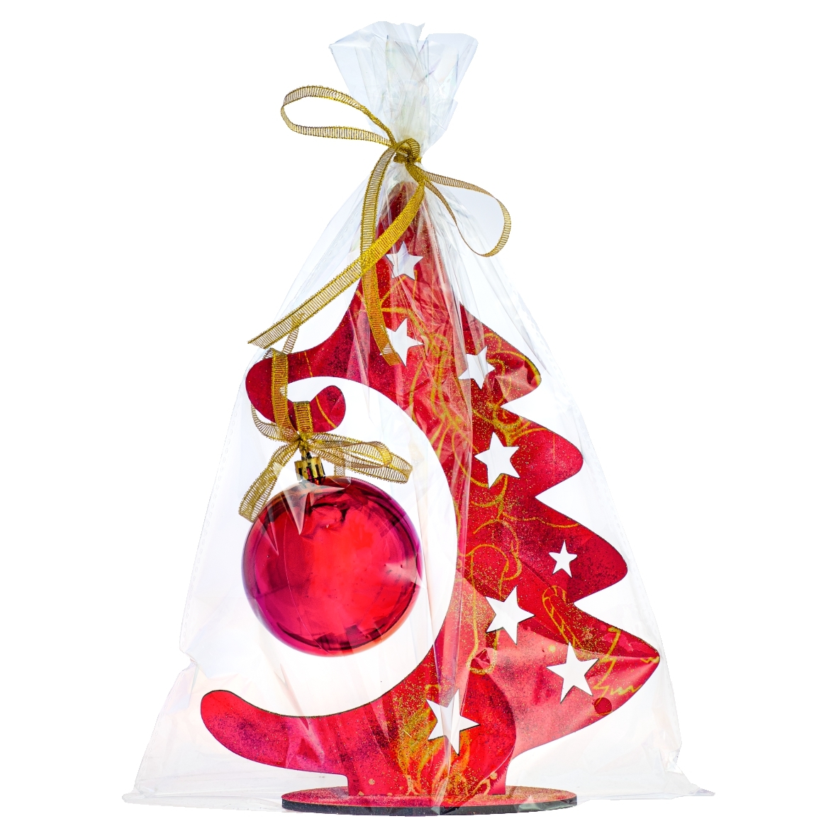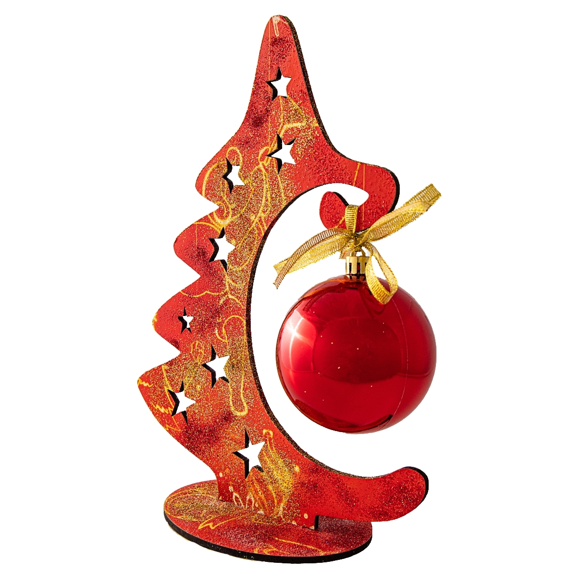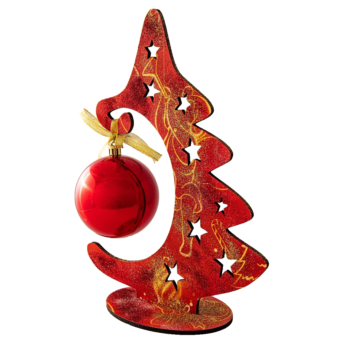 O decorațiune colorată și strălucitoare care va înveseli și va innobila căminul dumneavoastră pentru Sărbătoarea de Crăciun. Brad din MDF de 4 mm acoperit cu autocolant printat, este decorat cu glob de diametru de 7 cm și tapetat cu glitter rosu. Dimensiuni: înălțime 27 cm, lățime 20 cm. Culoarea globului poate să difere în funcție de stocurile disponibile. Decorațiunea se vinde ambalată în celofan transparent strans cu fundă de cadou, ceea ce o face un cadou deosebit pentru cei dragi. Produs cu pasiune în România de Kingaroma srl.