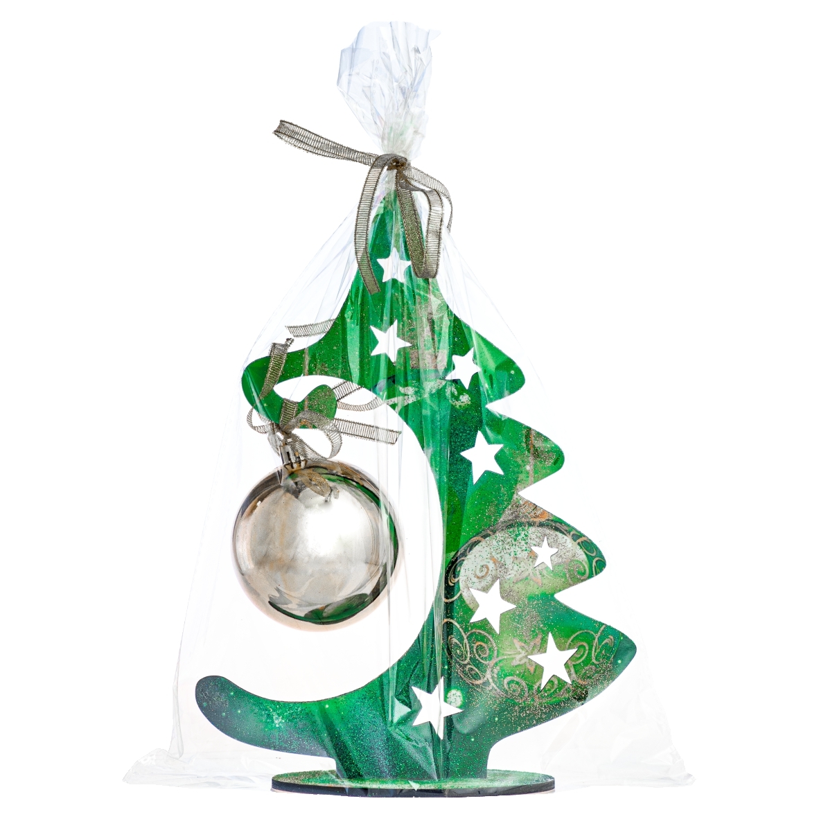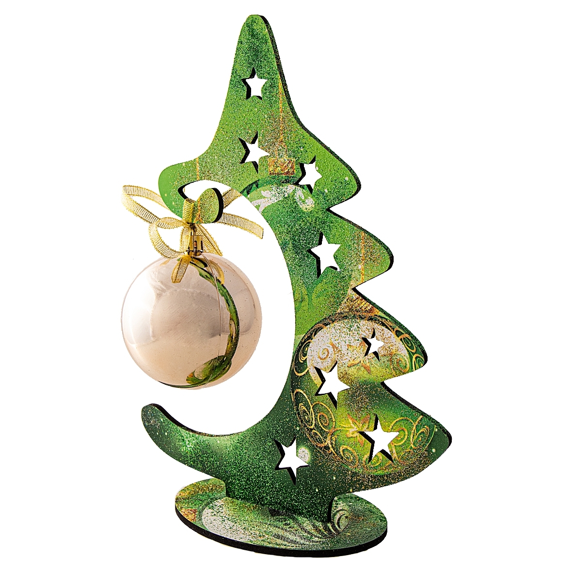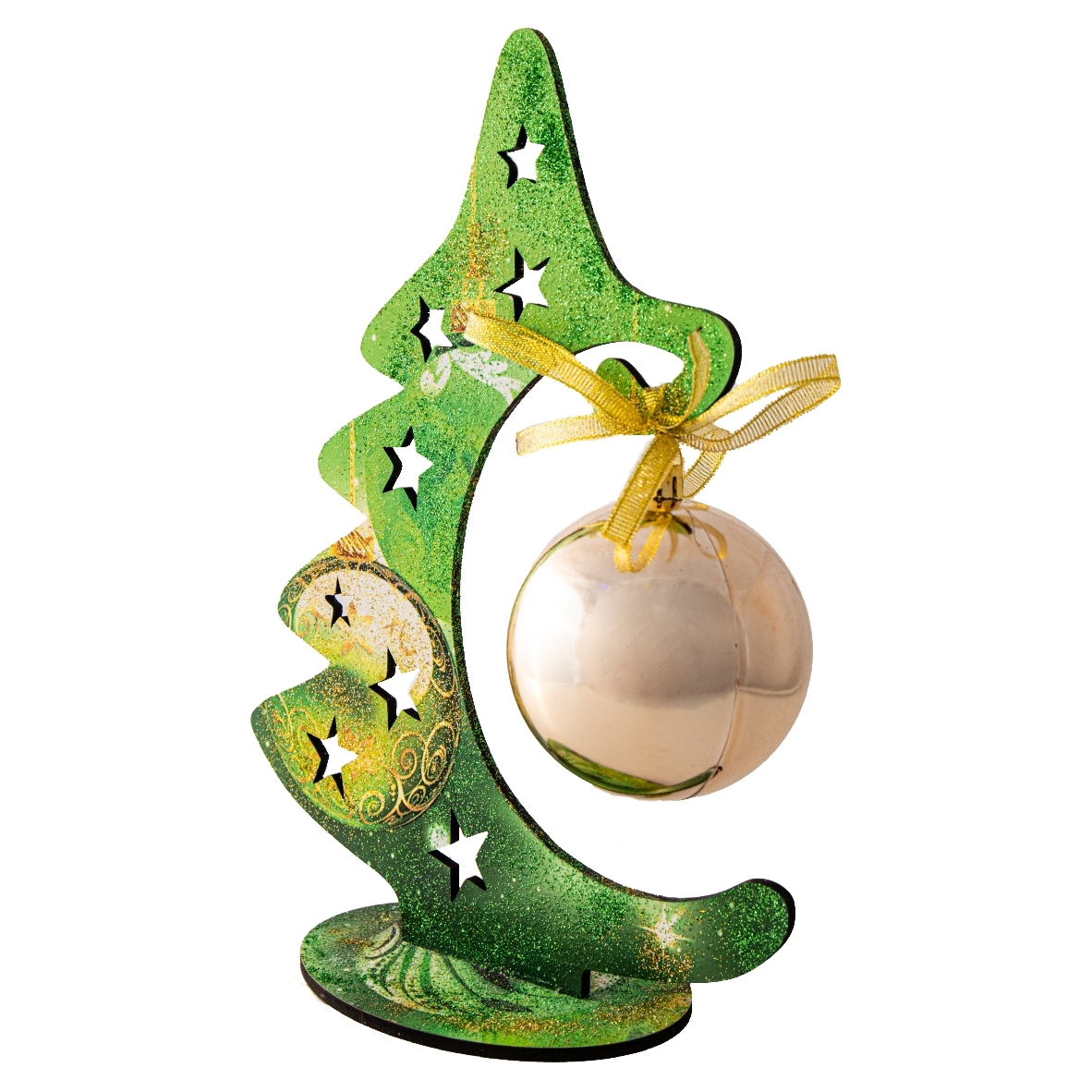 O decorațiune colorată și strălucitoare care va înveseli și va innobila căminul dumneavoastră pentru Sărbătoarea de Crăciun. Brad din MDF de 4 mm acoperit cu autocolant printat, este decorat cu glob de diametru de 7 cm și tapetat cu glitter verde și auriu. Dimensiuni: înălțime 27 cm, lățime 20 cm. Culoarea globului poate să difere în funcție de stocurile disponibile. Decorațiunea se vinde ambalată în celofan transparent strans cu fundă de cadou, ceea ce o face un cadou deosebit pentru cei dragi. Produs cu pasiune în România de Kingaroma srl.