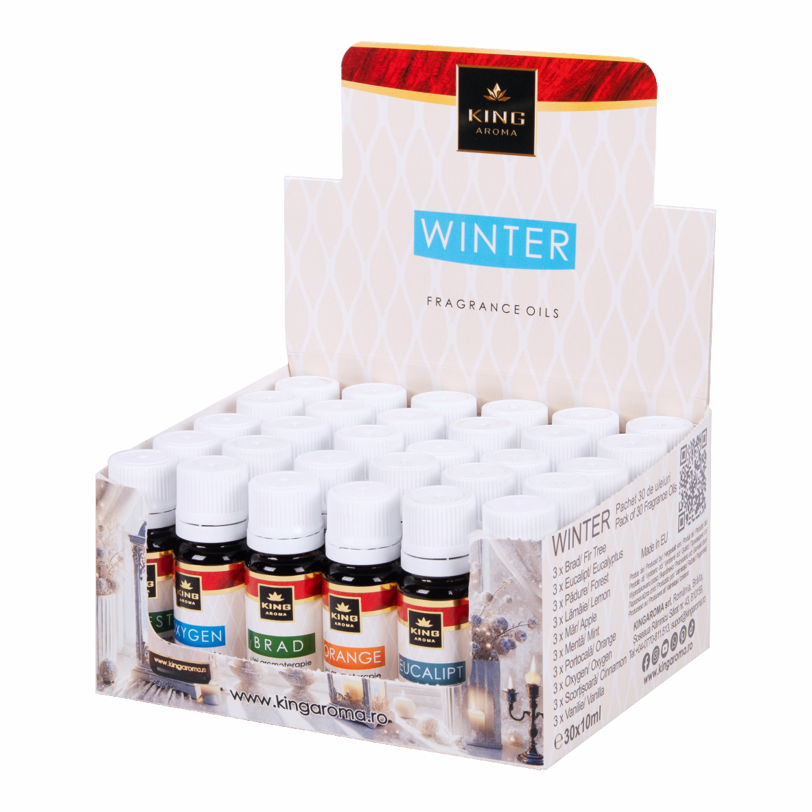 Transformă-ți casa într-un sanctuar de iarnă cu setul de 30 uleiuri parfumate KingAroma Winter Edition! Arome autentice de Brad, Eucalipt, Forest, Lamaie, Măr verde, Mentă, Orange, Oxygen, Scorţişoară, Vanilie, perfecte pentru aromaterapie, umidificatoare și parfumarea încăperilor. Ideal pentru relaxare, cadouri și sezonul sărbătorilor!