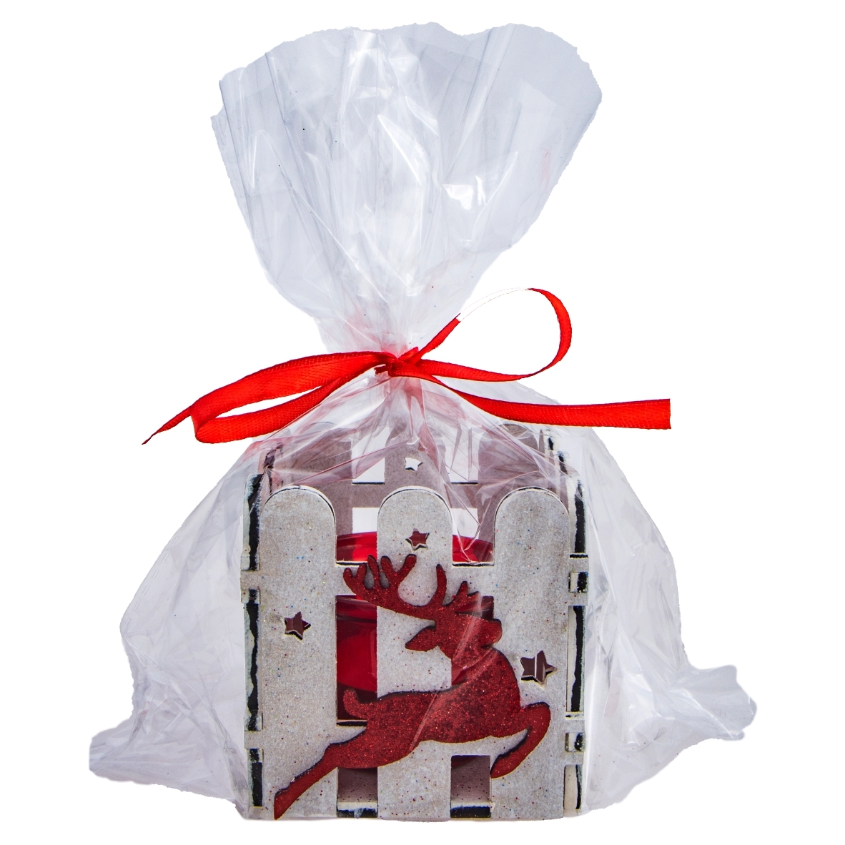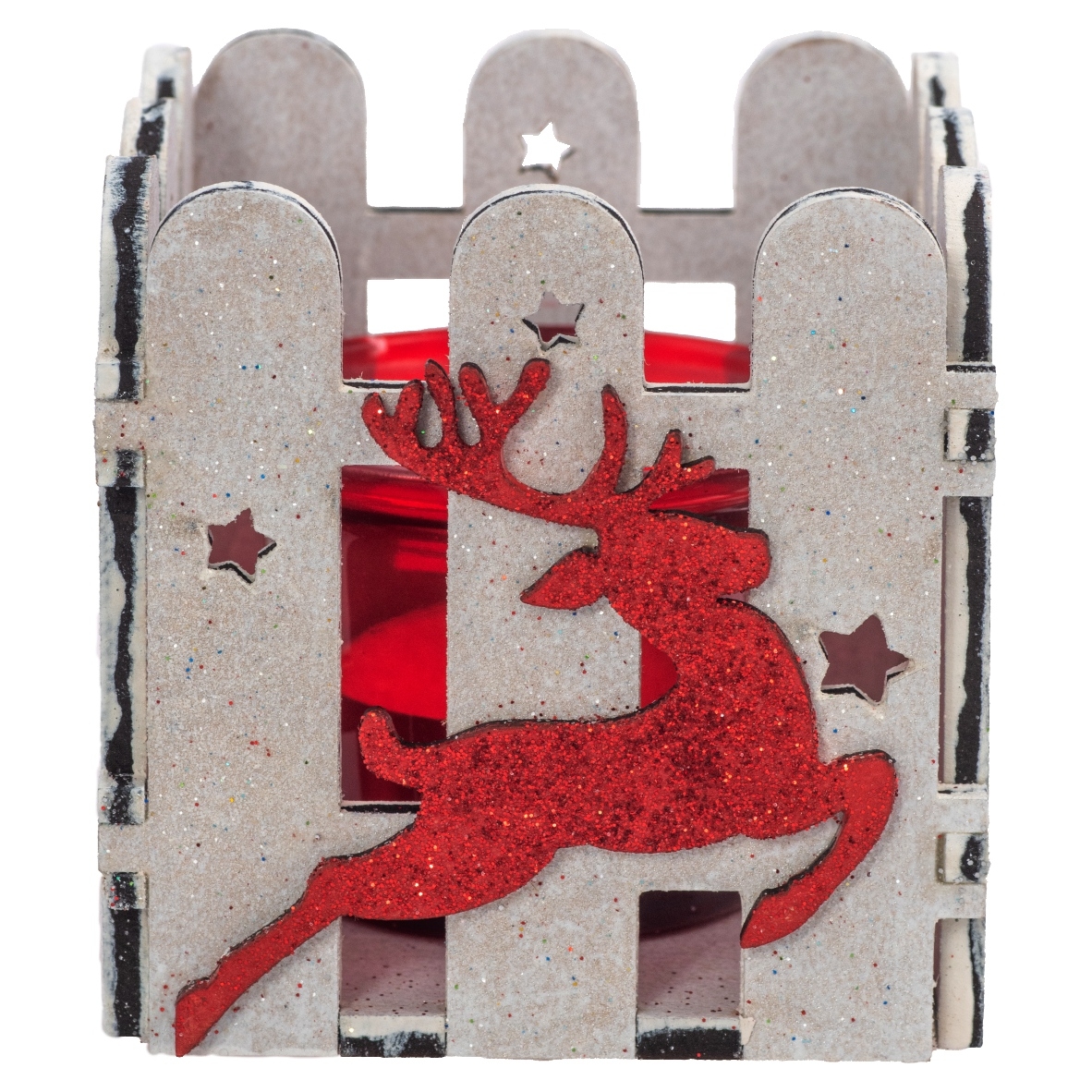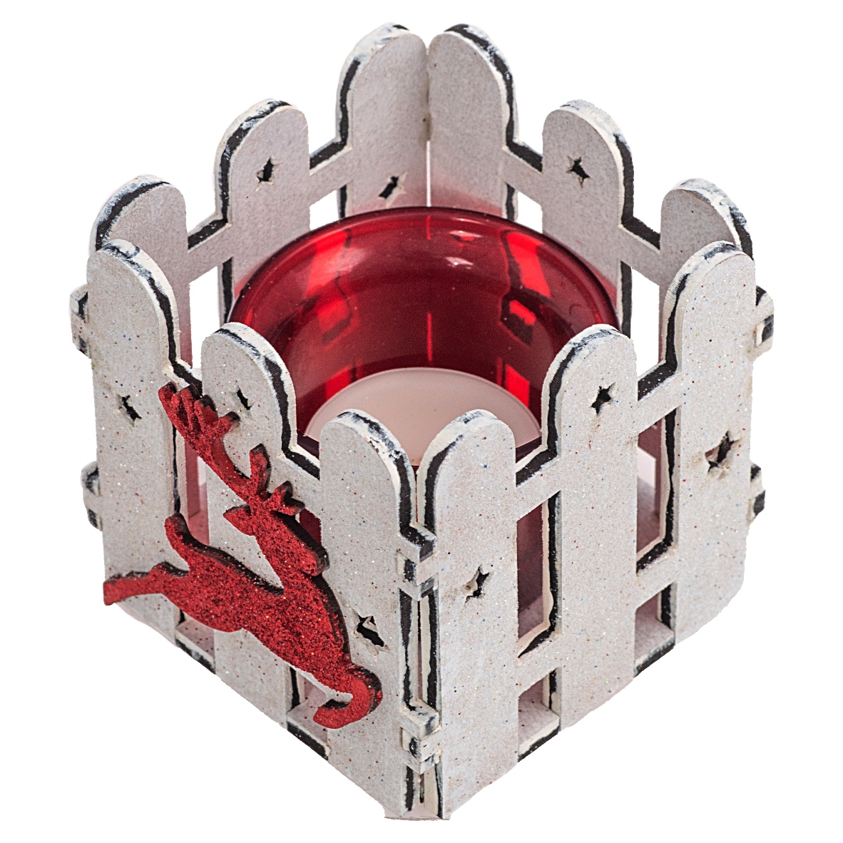 Decorațiunea este confecționată din MDF de 4 mm, vopsită în alb și înnobilată cu glitter pentru un pic de magie. Lumănarea tip pastilă luminează paharul roșu și imparte lumină împrejurul ei. Lumânarea și paharul de sticlă sunt incluse. În pahar se pot pune lumânari cu diametrul de 4 cm.