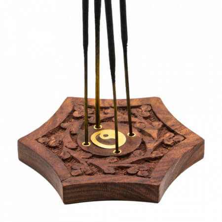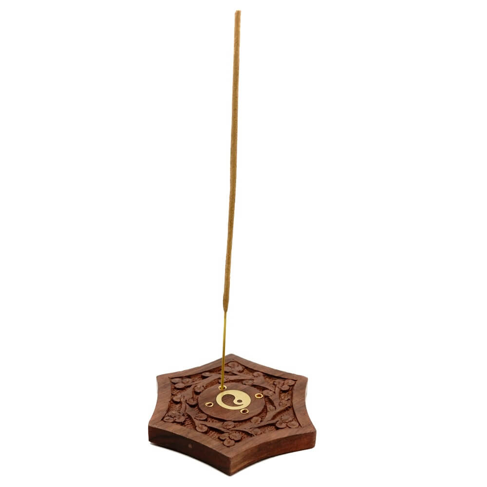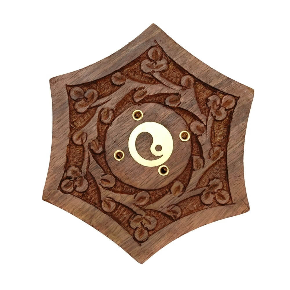 Suportul pentru conuri și bețișoare parfumate Hexagon este realizat din lemn natural și decorat cu simbolul Yin Yang, reprezentând echilibrul și armonia. Ideal pentru arderea conurilor parfumate și a bețelor de tămâie, acest suport creează o atmosferă calmă și relaxantă în orice spațiu.