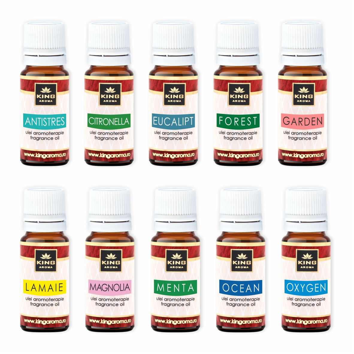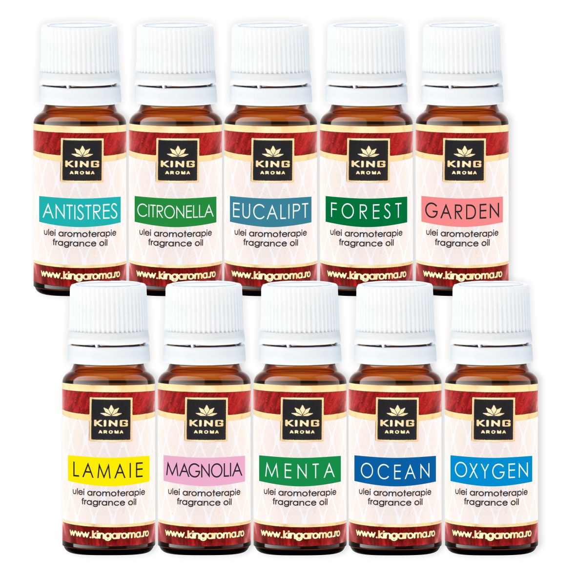 Conține 30 bucăți de uleiuri aromaterapie 10 ml arome fresh, căte 3 bucăți din urmatoarele arome: Antistres, Citronella, Eucalipt, Forest, Garden, Lamaie, Magnolia, Menta, Ocean, Oxygen.